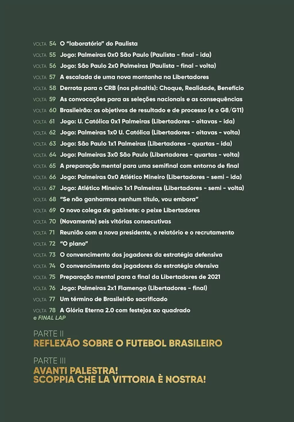 A obra traz as experiências e os desafios enfrentados pelos profissionais portugueses ao longo de seus 13 primeiros meses no futebol brasileiro, com revelações inéditas sobre o pensamento, a filosofia e os métodos de trabalho da comissão – incluindo detalhes inéditos da preparação de 16 jogos-chave, com exercícios e as respectivas análises pré e pós-jogo.