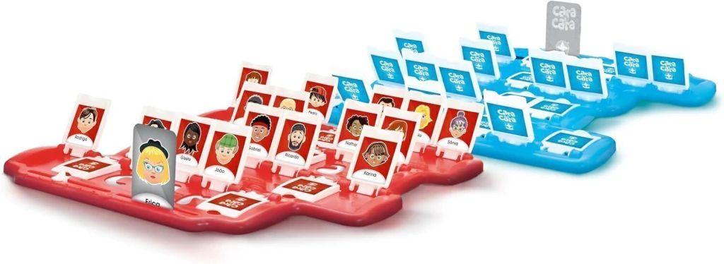 É loira? É mulher? Tem olhos verdes? Faça quantas perguntas precisar para descobrir qual é a "cara" do seu adversário. Brinquedos Estrela é um fabricante líder de brinquedos. Vasta gama aos melhores preços. Inclui 2 tabuleiros plásticos, 48 molduras plásticas, 1 folha com 48 rostos, 1 folha com 24 cartas e 1 manual de instruções.