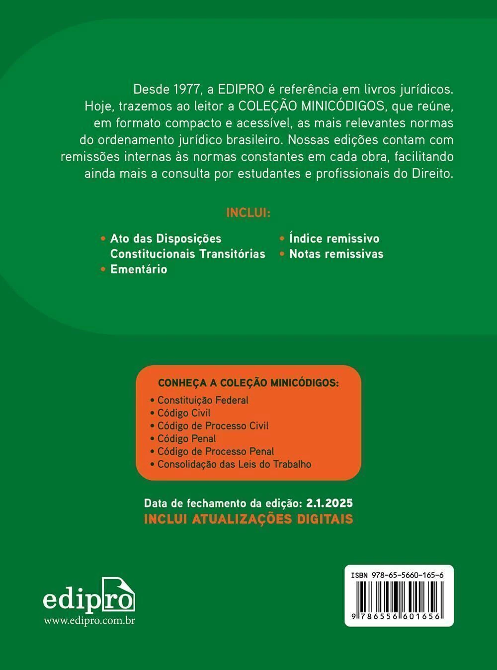Desde 1977, a EDIPRO é referência em livros jurídicos. Hoje, trazemos ao leitor a COLEÇÃO MINICÓDIGOS, que reúne, em formato compacto e acessível, as mais relevantes normas do ordenamento jurídico brasileiro. Nossas edições contam com remissões internas às normas constantes em cada obra, facilitando ainda mais a consulta por estudantes e profissionais do Direito.