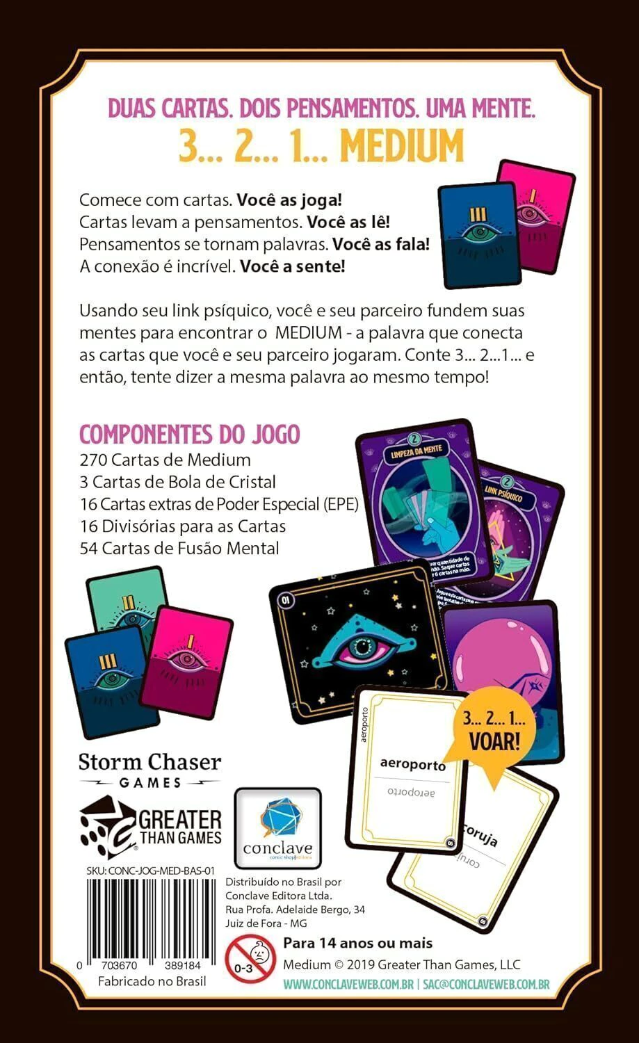 Duas cartas. Dois pensamentos. Uma mente. 3… 2… 1… MEDIUM! Comece com cartas. Você as joga! Cartas levam a pensamentos. Você as lê! Pensamentos se tornam palavras. Você as fala! A conexão é incrível. Você a sente! Usando seu link psíquico, você e seu parceiro fundem suas mentes para encontrar o MEDIUM – a palavra que conectaas cartas que você e seu parceiro jogaram. Conte 3… 2…1… e então, tente dizer a mesma palavra ao mesmo tempo!