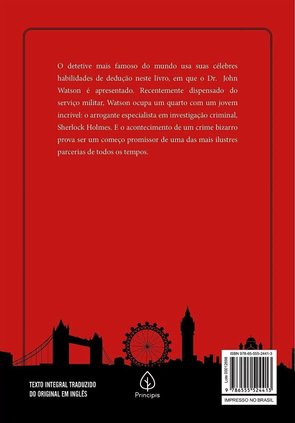 O detetive mais famoso do mundo usa suas célebres habilidades de dedução neste livro, em que o Dr. John Watson é apresentado. Recentemente dispensado do serviço militar, Watson ocupa um quarto com um jovem incrível: o arrogante especialista em investigação criminal, Sherlock Holmes. E o acontecimento de um crime bizarro prova ser um começo promissor de uma das mais ilustres parcerias de todos os tempos.